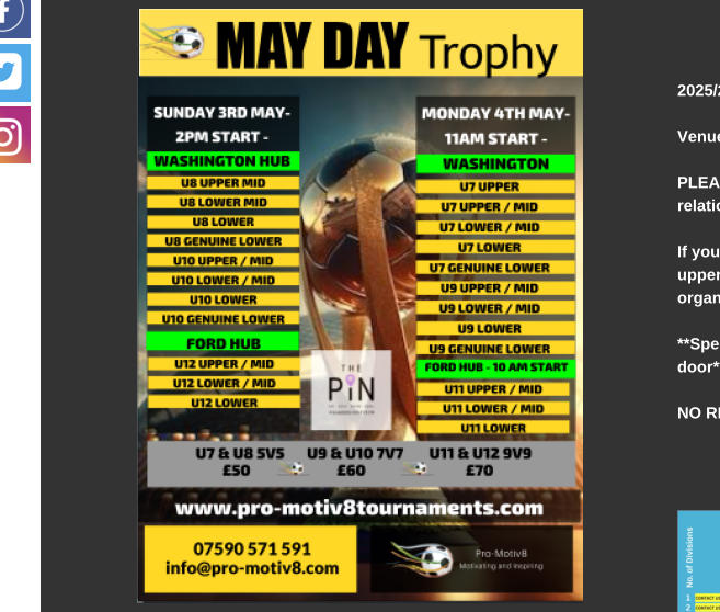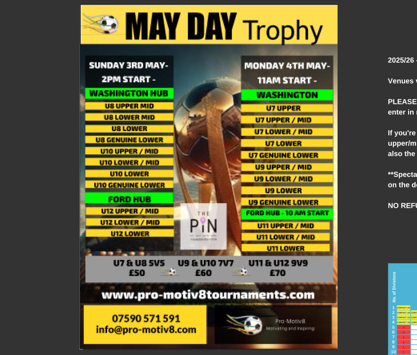 Spectator fees - £4 per player payable on the day AS A TEAM. No academy players allowed. (This may be updated). Please arrive 45 mins before kick off to avoid being held up by queues There is a live score system in place. Each age group can view scores and tables real time at Pro- motiv8.Spawtz.com. Scores go out live on twitter where there’s also a link to view fixtures and standings. ‘Futsalnortheast’. Registrations won’t be confirmed until payment has been made. Teams will be held on the wait list. Tournaments all year round. Venue – Washington Hub, Stephenson Road, NE37 3HR Once registered please remember your log in details as you can view your statement and register for further tournaments without re-registering. One email address can only be used once but you can register multiple teams via this one email address as team organiser. Cancellation Policy: No refunds.