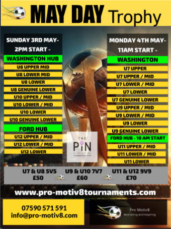 Spectator fees - £4 per player payable on the day AS A TEAM. No academy players allowed. (This may be updated). Please arrive 45 mins before kick off to avoid being held up by queues There is a live score system in place. Each age group can view scores and tables real time at Pro-motiv8.Spawtz.com. Scores go out live on twitter where there’s also a link to view fixtures and standings. ‘Futsalnortheast’. Registrations won’t be confirmed until payment has been made. Teams will be held on the wait list. Tournaments all year round. Venue – Washington Hub, Stephenson Road, NE37 3HR Once registered please remember your log in details as you can view your statement and register for further tournaments without re-registering. One email address can only be used once but you can register multiple teams via this one email address as team organiser. Cancellation Policy: No refunds.